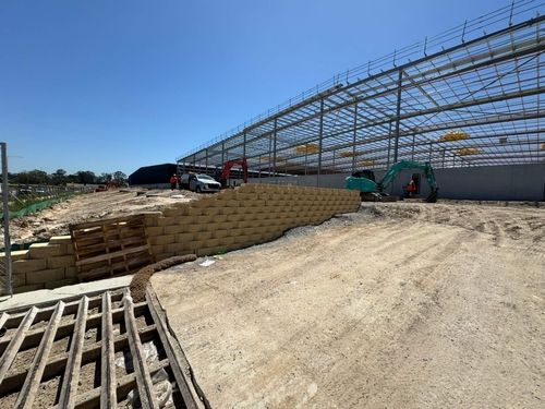 Konceptual engineered Keystone modular walls with no-fines concrete backfill, removing the need for heavy compaction near the warehouse. The design addressed 20 kPa surcharge loads, streamlined service and drainage integration, and was delivered on an accelerated timeline for immediate construction.